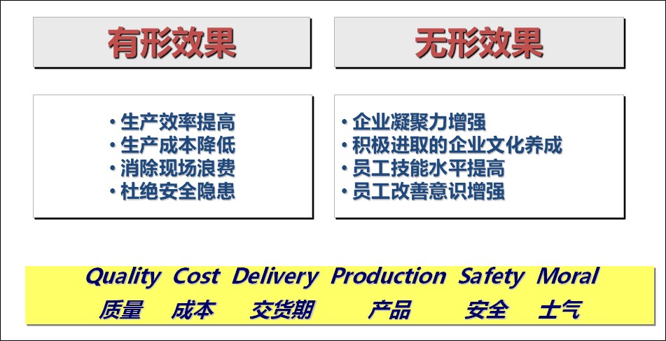 5S管理融合精益管理的工具,消除現(xiàn)場一切不合理事項,持續(xù)的5S管理建立最佳的4M1E(人機料法環(huán))生產(chǎn)條件,完善設(shè)備管理體系,強化設(shè)備預防管理(保養(yǎng)、點檢、改良),提高生產(chǎn)綜合效率(OEE),優(yōu)化生產(chǎn)制度及流程,達致P(產(chǎn)品)Q(質(zhì)量)C(成本)D(交期)M(士氣)S(安全)的全面提升。