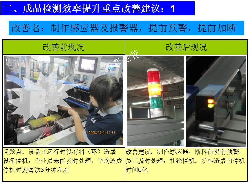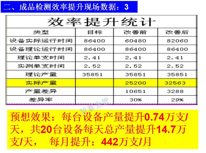 世界級制造及精益管理是智泰人一生追求的理想,智泰咨詢在企業(yè)推進(jìn)精益生產(chǎn)后平均生產(chǎn)效率提升35%以上,智泰專業(yè)團(tuán)隊為企業(yè)消除八大浪費,通過精益管理,提高企業(yè)的生產(chǎn)效率和產(chǎn)品質(zhì)量,持續(xù)推進(jìn)焦點課題改進(jìn)重大問題,每年給企業(yè)帶來的收益平均有800萬以上,附件為智泰咨詢顧問團(tuán)隊為某企業(yè)生產(chǎn)效率提升的案例,請查閱: