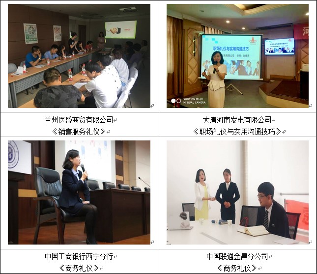 ● 曾為蘭州交通大學(xué),進(jìn)行了16期《職業(yè)素養(yǎng)與禮儀》課程培訓(xùn),并在一年內(nèi)開展了近30場禮儀培訓(xùn)講座,授課人次高達(dá)1000多人。課程內(nèi)容結(jié)合我國禮儀文化與當(dāng)代禮儀現(xiàn)狀,傳授禮儀知識和操作技能,讓學(xué)員真正了解“禮”和“儀”在職場中的關(guān)鍵性作用,促使學(xué)員對自身氣質(zhì)、風(fēng)度、言行舉止有了更高更深的要求……