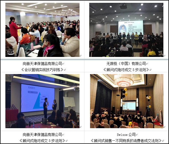 ★ 曾給尚赫天津保健用品有限公司員工講授《會(huì)議營(yíng)銷實(shí)戰(zhàn)技巧訓(xùn)練》、《顧問式銷售邀約技巧》、《銷售贏在溝通》、《顧問式絕對(duì)成交5步法則》等系列課程,協(xié)助企業(yè)完成精英團(tuán)隊(duì)的打造,培訓(xùn)過程采用項(xiàng)目方式,邊培訓(xùn),邊領(lǐng)導(dǎo)團(tuán)隊(duì)實(shí)施項(xiàng)目改善,經(jīng)過《會(huì)議營(yíng)銷實(shí)戰(zhàn)技巧訓(xùn)練》課程后,團(tuán)隊(duì)學(xué)以致用,在實(shí)際銷售實(shí)踐中,團(tuán)隊(duì)銷售翻翻。在此期間培訓(xùn)返聘率達(dá)到100%。