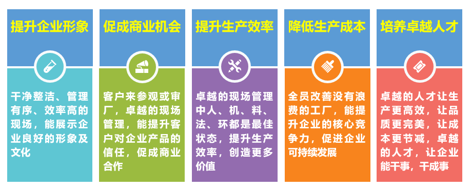 通過(guò)全員參與現(xiàn)場(chǎng)規(guī)范一切的改善活動(dòng),打造一個(gè)干凈、整潔、明亮、規(guī)范、安全的現(xiàn)場(chǎng)。促進(jìn)生產(chǎn)效率提升,提高品質(zhì),降低成本,培養(yǎng)人才,提升企業(yè)核心競(jìng)爭(zhēng)力!