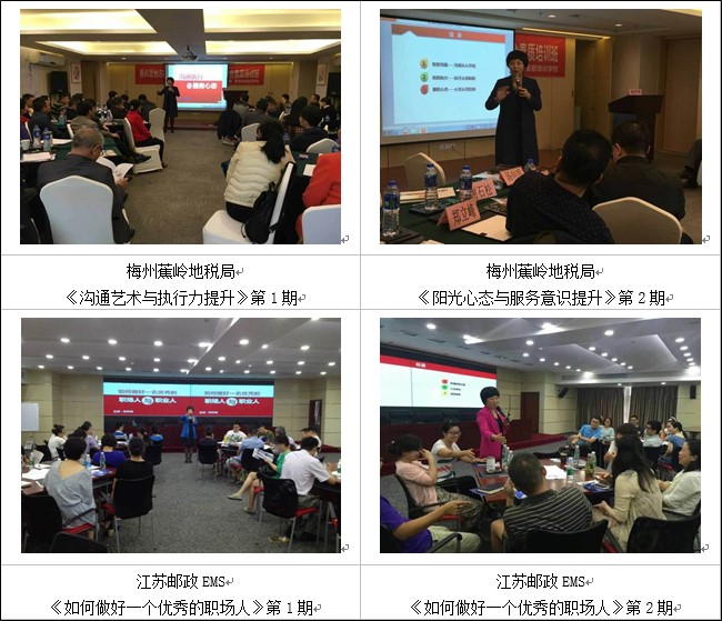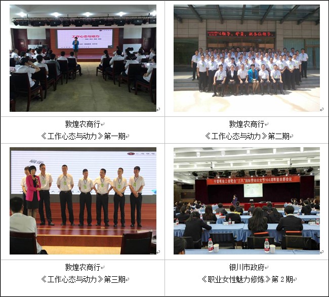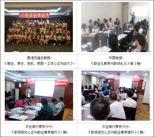 2012年至2014年為河南省郵政、山東省農(nóng)行、廣東省中行、浙江省建行、廣東省工行、廣東省農(nóng)信社、廣西農(nóng)信社進行《陽光心態(tài)與職業(yè)素養(yǎng)提升》、《正能量與責(zé)任》全省輪訓(xùn)共110余期,學(xué)員滿意度都高達97%以上,返聘率高達85%。