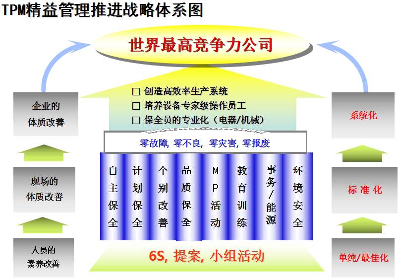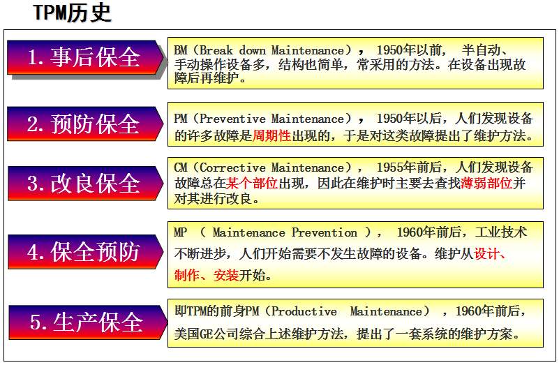TPM咨詢公司中對于TPM管理的解釋是英文Total Productive Maintenance的縮略語,中文譯名叫全員生產(chǎn)維護,又譯為全員生產(chǎn)保全:《T (Total)全員 所有部門全員參加的意思;P (Productive)生產(chǎn) 效率提升追求故障 0 化, 不良 0 化, 災(zāi)害 0 化,浪費 0 化;M (Maintenance)維護(保全) 追求極限效率為目的生產(chǎn)體系維持理想狀態(tài)的活動》。這是日本人在70年代提出的,是一種全員參與的生產(chǎn)維護方式,其主要點就在“生產(chǎn)維護”及“全員參與”上。通過建立一個全系統(tǒng)員工參與的生產(chǎn)維護活動,使設(shè)備性能及員工綜合技能達(dá)到最優(yōu)。TPM咨詢管理的提出是建立在美國的生產(chǎn)維護體制的基礎(chǔ)上。在非日本國家,由于國情不同,對TPM的理解是:利用包括操作者在內(nèi)的生產(chǎn)維護活動,是以提高OEE(設(shè)備綜合效率)為目標(biāo),以全系統(tǒng)的預(yù)防維護為過程,全體人員參與為基礎(chǔ)的設(shè)備保養(yǎng)和維護管理體系。