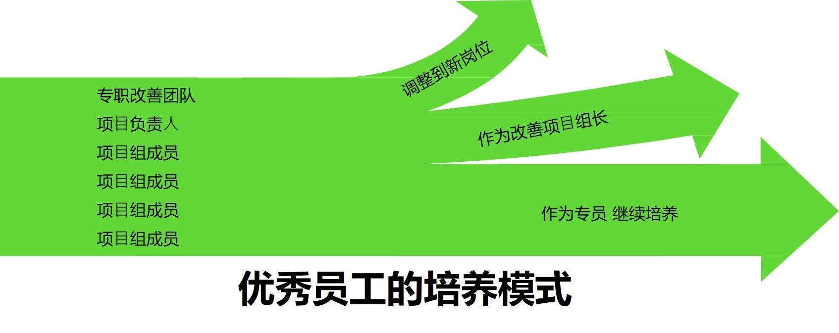各分車間選撥專職人員,首先作為改善提案和核心人員或?qū)T進(jìn)行培養(yǎng),接受咨詢顧問(wèn)和推進(jìn)辦的指導(dǎo),承擔(dān)部門(mén)內(nèi)項(xiàng)目負(fù)責(zé)人或項(xiàng)目成員的角色,根據(jù)在項(xiàng)目中的表現(xiàn),調(diào)整到合適的新崗位或晉升(繼續(xù)專職或兼職改善工作)